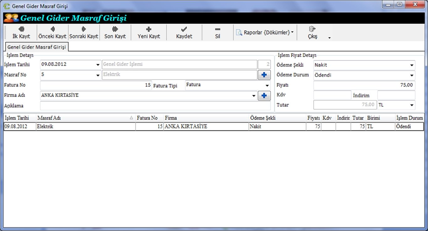 Genel Gider Masraf Giriş Ekranı
