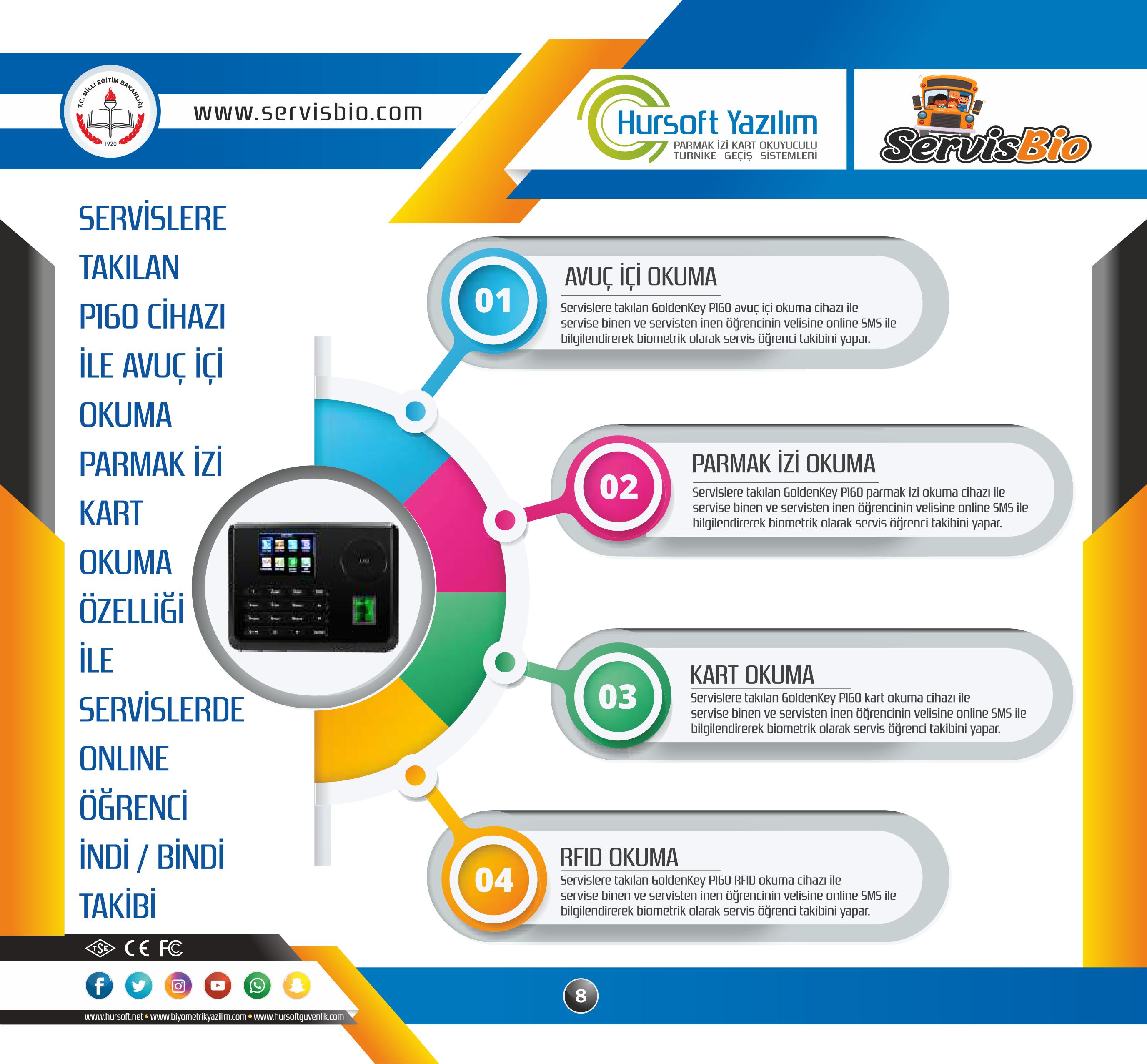Araç (servis, taksi, dolmuş, kamyon, otobüs, minibüs vb.) içerisine yerleştirilen okuyucu ve algılayıcılar (parmak izi, kart, yüz tanıma, avuç içi, damar okuma, rfid, nfc, kare kod, barkod, giyilebilir teknoloji üzerindeki sensör vb.), RS232 / 485, TCP / IP, USB, Wifi, Bluetooth kablolu veya kablosuz veri iletişimi ile öğrencilerin, tüm ayırt edici özelliklerini ve resmini Tablet Pc üzerindeki yazılım ile anlık(ONLİNE) bağlantıya geçerek cep telefonu mobil uygulamasına ve merkez bilgisayardaki web tabanlı yazılımımıza aktarır.